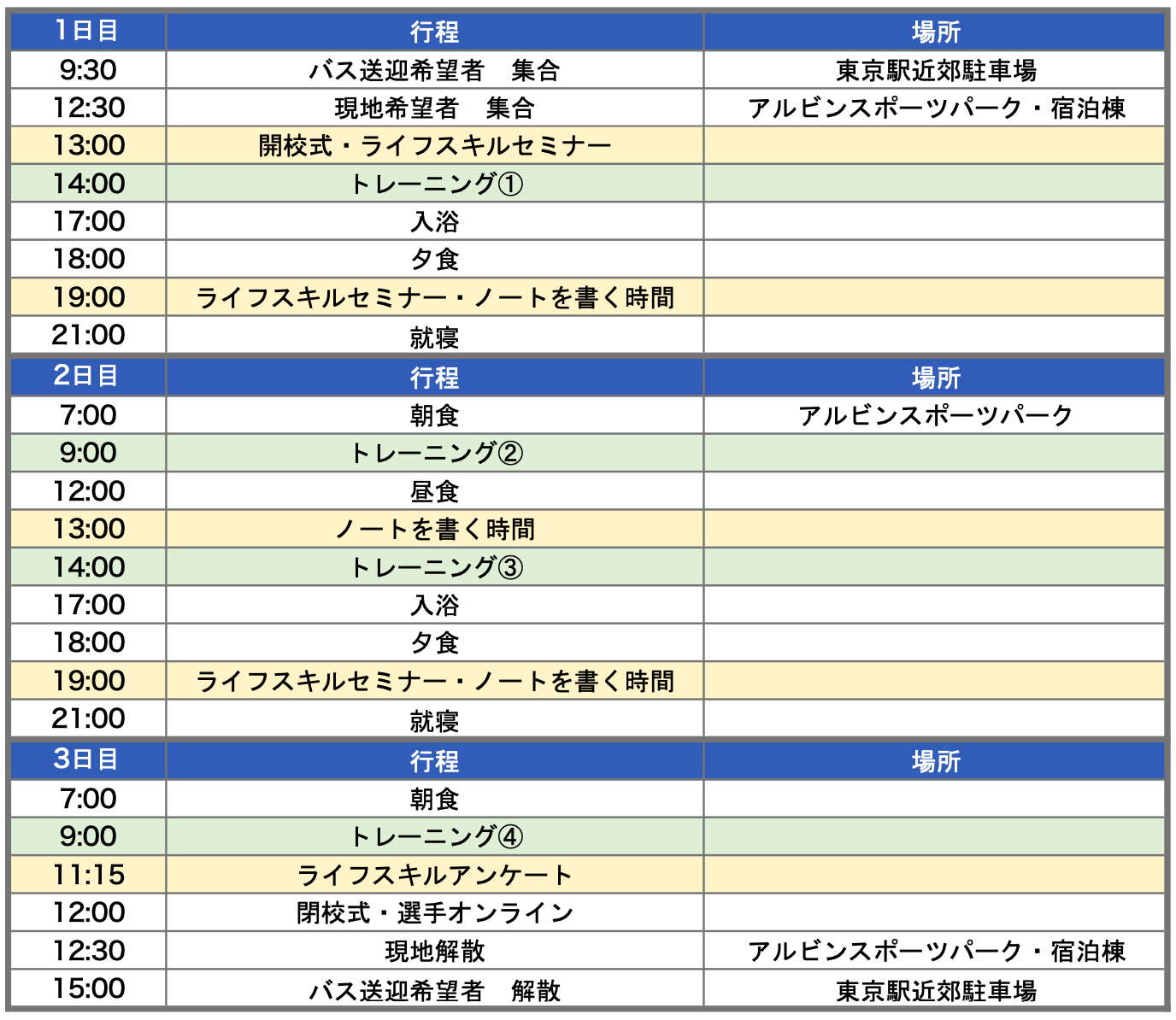 ・キャンプ期間中は、保護者から離れ非日常体験を経験するため練習見学は原則禁止とさせていただきます。