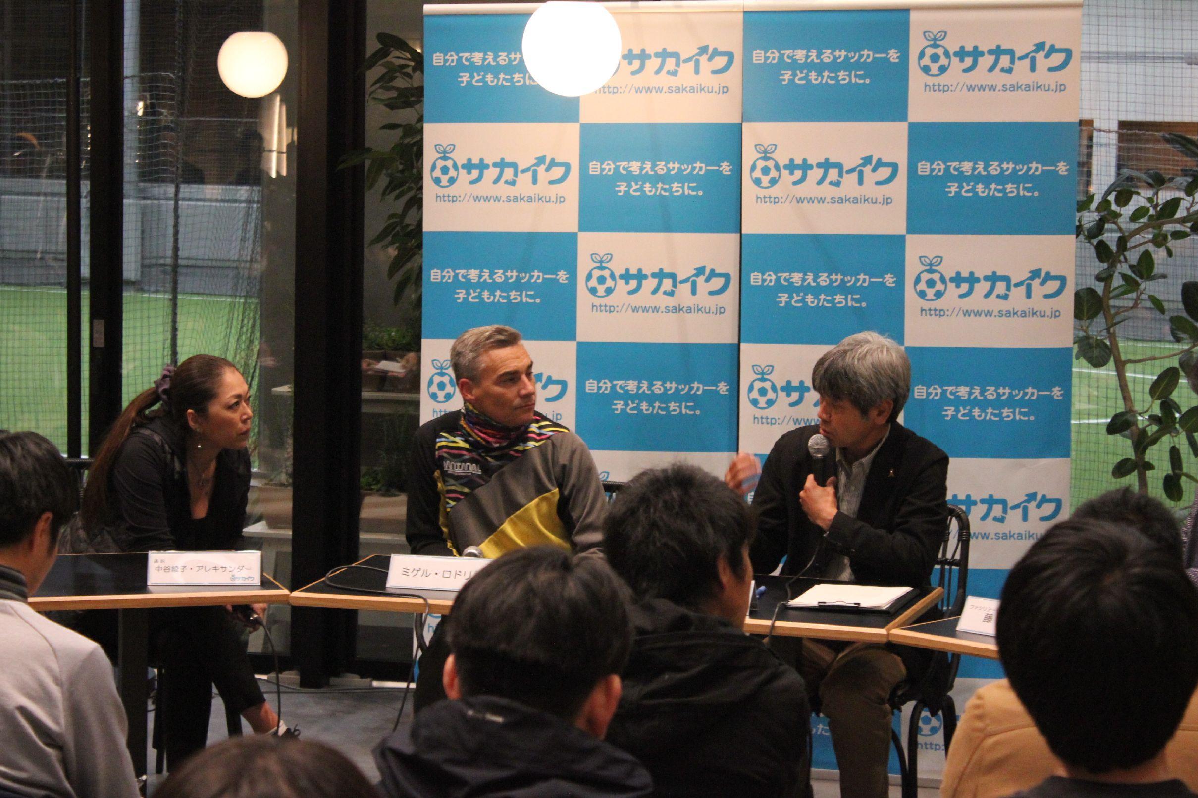 続けて、池上さんがミゲルさんに質問したのは「子どもとコーチの関係」でした。池上さんの目には、日本の子どもとコーチの間に上下関係が存在しているように映っていて、そのことが子どもの自由な発想やプレーを抑制している原因の一つだと見えているようです。池上さんは「子どもたちはプレッシャーやストレスの中で生活しています。だからこそ、サッカーやフットサルのトレーニングに来た時に選手が自由にプレーするためには『遊び』の要素が重要」だと語りました。![]()