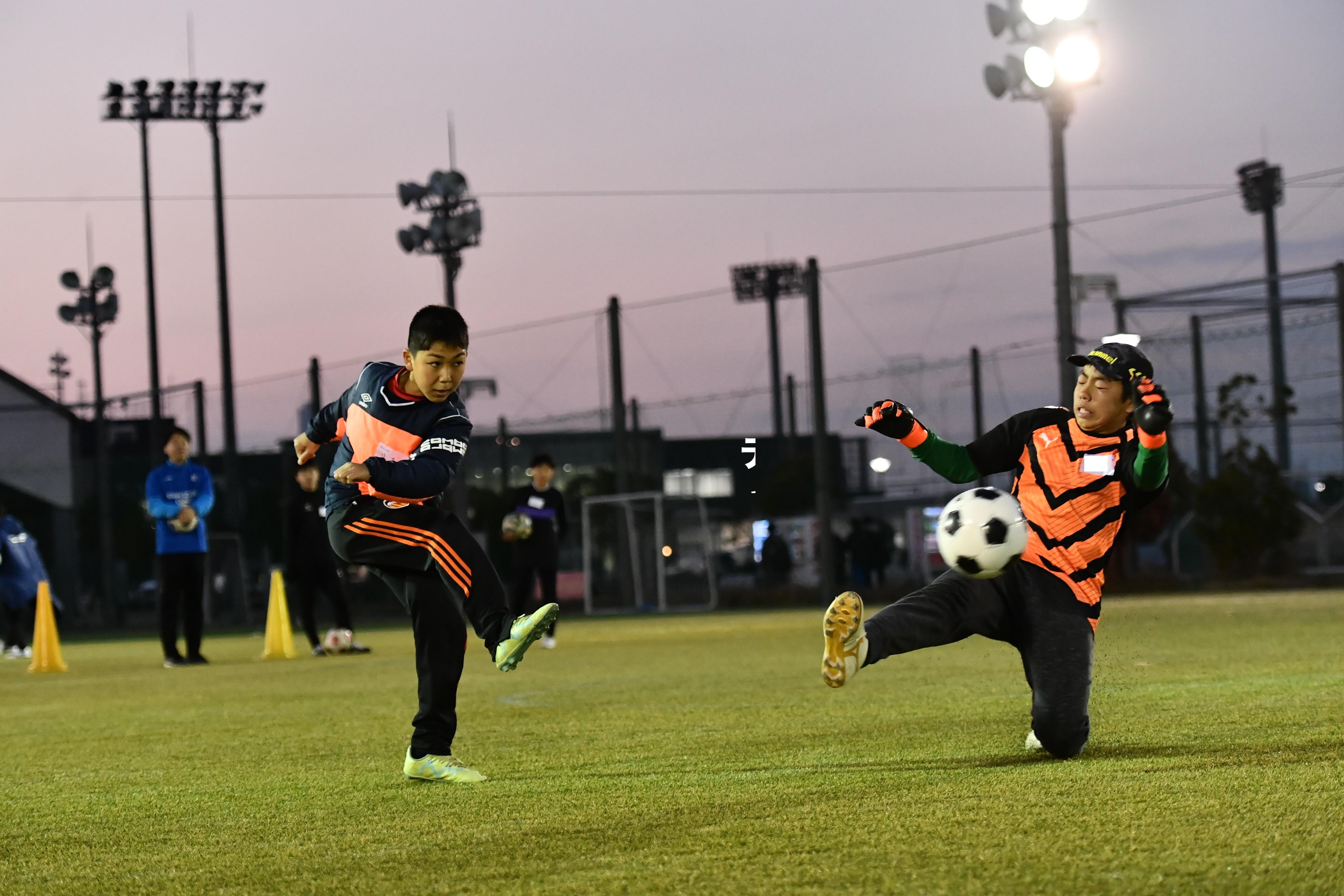 GK技術を学んだ選手たちと真剣勝負を行い、実戦の中で強いシュートを打つ方法を学びました。