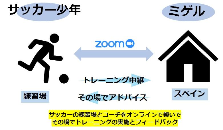 スペインにいるミゲルコーチと日本の子どもたちをオンラインで繋ぎレッスンを行います。