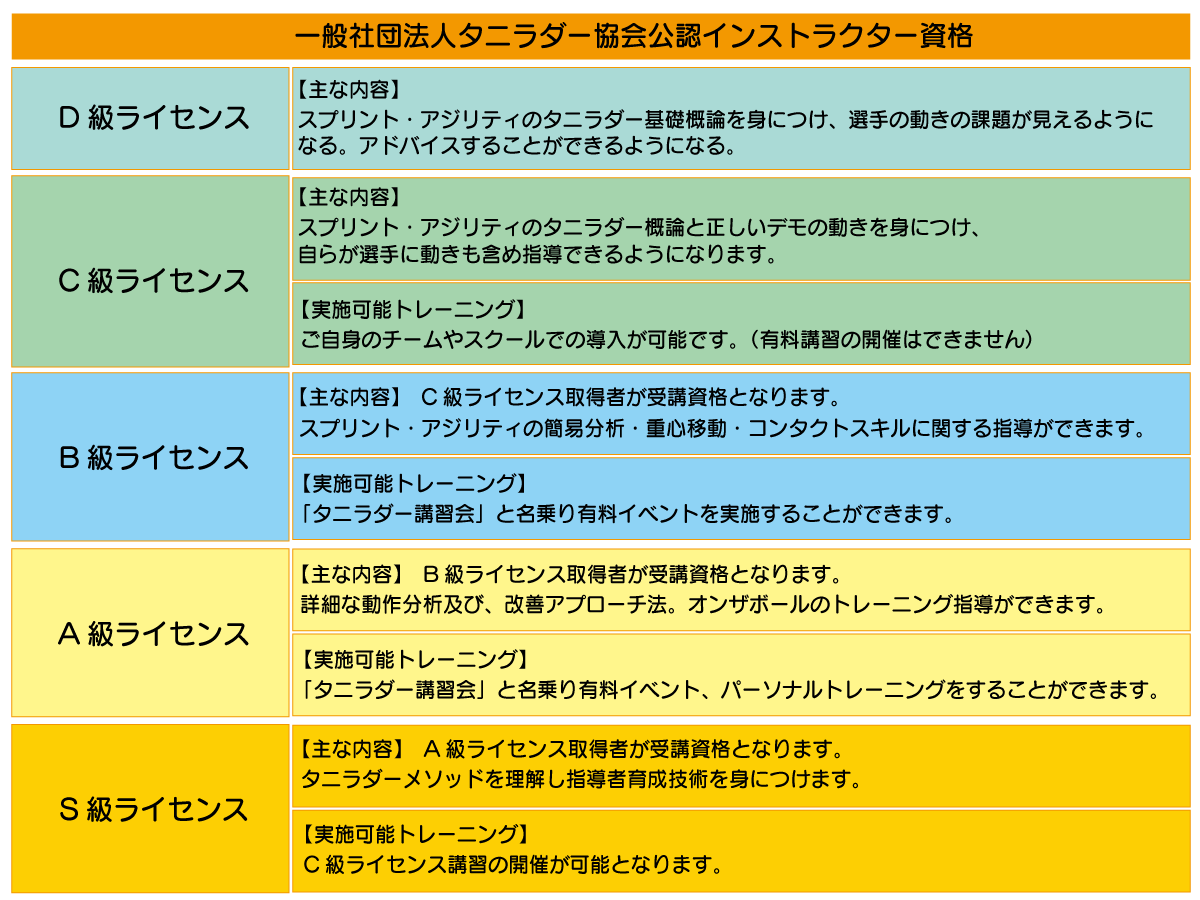なお、C級取得者はタニラダー講習会のアシスタントインストラクターとして活動も可能となります。